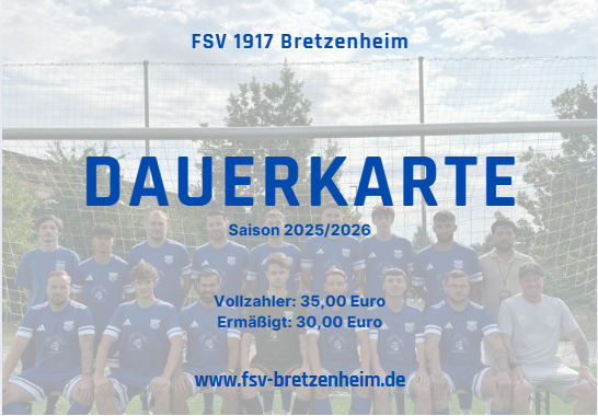 Bestellt jetzt eure Dauerkarte vor. Mailt uns euren Dauerkartenwunsch an info@fsv-bretzenheim.de, nennt den Vor- und Nachnamen der Person, auf den die Dauerkarte ausgestellt werden soll und erteilt uns ein Lastschriftmandat. Nennt uns dafür den Kontoinhaber und eure IBAN. Die Dauerkarte wird dann zum 1. Heimspiel gegen den FC Schmittweiler-Callbach II zugesendet, oder liegt zur Abholung beim Pokalheimspiel gegen die SG Disibodenberg bereit.